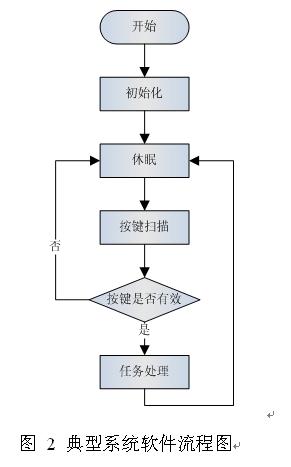圖2是一個(gè)具有休眠功能的典型系統(tǒng)軟件流程圖。系統(tǒng)初始化后進(jìn)入休眠模式,經(jīng)過(guò)一段時(shí)間的延時(shí)后喚醒掃描按鍵模塊,進(jìn)行按鍵掃描。如果有按鍵按下,軟件判斷是否有效。如果無(wú)效按鍵按下,那么系統(tǒng)繼續(xù)進(jìn)入休眠模式。如果軟件判斷按鍵有效,那么喚醒系統(tǒng),觸發(fā)任務(wù)處理進(jìn)程。當(dāng)處理完所有任務(wù)后,系統(tǒng)又重新進(jìn)入休眠狀態(tài)。這是個(gè)典型的具有休眠功能的系統(tǒng)工作流程圖,它的優(yōu)點(diǎn)就是此軟件流程簡(jiǎn)單易懂、容易實(shí)現(xiàn),一般可以滿(mǎn)足大多數(shù)場(chǎng)合的應(yīng)用。但是,如果系統(tǒng)任務(wù)處理消耗了較多的CPU處理時(shí)間,那么為了達(dá)到目標(biāo)平均工作電流,就需要相應(yīng)增加休眠時(shí)間。同時(shí)降低了按鍵掃描的頻率,從而加長(zhǎng)了系統(tǒng)喚醒的響應(yīng)時(shí)間。因此,此方法適合比較簡(jiǎn)單的、系統(tǒng)任務(wù)不復(fù)雜的應(yīng)用。