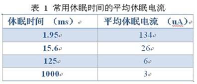 CY8C22x45系列芯片休眠時(shí)的工作電流僅有3uA[5],芯片內(nèi)包含一個(gè)休眠計(jì)數(shù)器,系統(tǒng)進(jìn)入休眠后計(jì)數(shù)器開(kāi)始遞減,當(dāng)計(jì)數(shù)值為零時(shí)產(chǎn)生中斷喚醒系統(tǒng)。喚醒系統(tǒng)后可以不做任何處理再次進(jìn)入休眠模式。這樣周而復(fù)始,達(dá)到所需要的整個(gè)休眠時(shí)間。在實(shí)際設(shè)計(jì)中,常常使用平均休眠電流替代公式2中的Isleep,即在每次休眠結(jié)束后,僅讓系統(tǒng)正常工作最短時(shí)間,該時(shí)間內(nèi)完成所有必須操作(僅是一次循環(huán)判斷),此時(shí)的電流即為該休眠時(shí)間下的平均休眠電流。表1列出了常用休眠時(shí)間的平均休眠電流。