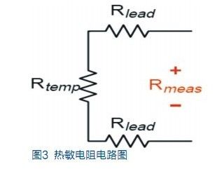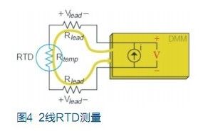 與熱敏電阻相似,鉑電阻溫度傳感器(RTD)也是用鉑制成的熱敏感電阻。當通過測量電壓計算RTD 溫度時,數(shù)字萬用表用已知電流源測量該電流源所產生的電壓。這一電壓為兩條引線(Vlead)上的壓降加RTD上的電壓(Vtemp)。例如,常用RTD 的電阻為100Ω,每1℃僅產生0.385Ω的電阻變化。如果每條引線有10Ω電阻,就將造成26℃的測量誤差,這是不可接受的。所以應對RTD作4線歐姆測量。
