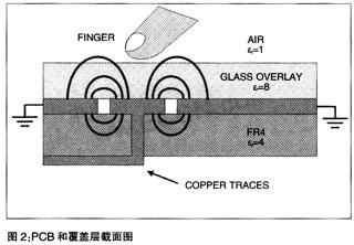 當把手指放在邊緣電場的附近時,電容式傳感系統(tǒng)的導電表面積會增加。由手指所產(chǎn)生的額外電荷存儲容量,就是我們所知的手指電容CF。在本文中,無手指觸摸時的傳感器電容用CP來表示,意指寄生電容。