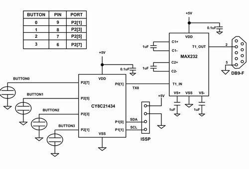為了實現(xiàn)電容式傳感和串行通信,該電路采用了賽普拉斯的CY8C21x34系列中的PSoC IC芯片。該芯片包含一組模擬和數(shù)字功能塊,這些功能塊可由存儲于板上閃存中的固件來配置。另一顆芯片負責處理RS232的電平移位,以便建立到主機的通信鏈接,并實現(xiàn)波特率為115,200的電容式傳感數(shù)據(jù)記錄。四個電容傳感按鍵的引腳分配在圖5的表中給出。PSoC是通過一個包含電源、地以及編程引腳SCL和SDA的ISSP接頭來實現(xiàn)編程的。而通過一個DB9連接器將電腦與電容式傳感電路板相連。