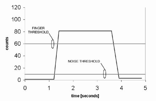 噪聲門限被設定的計數(shù)值為10,而手指門限設定的計數(shù)值則為60。實際上,在實際計數(shù)數(shù)據(jù)中噪聲分量是始終存在,圖中沒有顯示是為了能清晰地顯示門限水平。