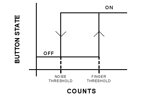 該轉移函數(shù)中的延滯帶來了開關狀態(tài)之間的快速轉換,即使計數(shù)是有噪聲的情況下也不例外。同時這還給按鍵帶來了一種反跳功能。低門限被稱為“噪聲門限”,而高門限則被稱為“手指門限”。門限水平的設定決定了系統(tǒng)的性能。當覆蓋層非常厚時,信噪比很低。在此類系統(tǒng)中設定門限水平是一項具有挑戰(zhàn)性的工作,而這恰好是電容式傳感設計技巧的一部分。
