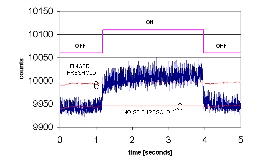 通過一個終端仿真程序,在主PC上獲得差分計數(shù),然后借助電子制表軟件加以繪制。將手指放置在10mm厚的玻璃覆蓋層上,并持續(xù)3秒的時間。按鍵的開關狀態(tài)被疊加在原始計數(shù)上。按鍵在這兩種狀態(tài)之間干凈利落地轉換,即使是由于通過厚玻璃進行檢測而使原始計數(shù)信號中具有較大的噪聲時也是如此。請注意手指和按鍵門限隨著基線的漂移而進行周期性調(diào)整。當檢測到手指的觸壓動作時,基線值將鎖定,直到手指移開為止。