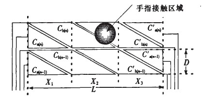 Ca(n)、Cb(n)、為第一組感應電極,Cb(n)、Cb(n)''''為第二組感應電極,Ca(n)''''、Cb(n)''''為第三組感應電極,分別感應X1、X2、X3范圍內坐標點的位置。具體坐標計算方法與上述類似。設計中需要注意X1、X2、X3每組電極的寬度應與手指接觸面積的寬度相當,如寬度不足則需要增加菱形電極,否則手指接觸在相同區域內無法識別兩個感應點。