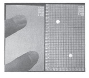 實際電極設計中,每對感應單元設計為多組電極,并根據Lens的厚度設計電極面積以及間隙大小。間隙過大會導致線縫可見,因此使用假電極進行填充使線縫在30μm以內則可以避免上述問題。經過實際測試,在實現單點觸控基本功能的同時,能夠實現兩點觸控,滿足設計要求。操作效果如圖5所示。