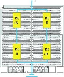 現代傳感器系統主要由兩個元件組成 —基本傳感器和信號處理專用集成電路 (ASIC)(圖 1)。現已證明,后來由 Lord Klevin 于 1857 年發現的各向異性磁阻效應特別適用于檢測磁場。首先考慮通常具有多種磁疇結構的鐵磁性材料。這些稱之為韋斯磁疇的結構,其內部磁化的方向彼此不同。如果將這種材料平鋪為一薄層,那么磁化矢量處于材料層平面方向。另外,可較精確地假設只存在一個磁疇。當這種元件暴露于外部磁場中時,后者會改變內部磁化矢量的方向。如果同時一股電流通過該元件,就會產生電阻(圖 2),這取決于電流和磁化之間的角度。當電流和磁化方向彼此成直角時,電阻最小,當二者平行時,電阻最大。電阻變化的大小取決于材料。鐵磁性材料的性質也決定對溫度的依賴性。電阻最大變化為 2.2% 并且對溫度變化反應良好的最佳合金是 81% 的鎳和 19% 的鐵組成的合金。恩智浦所有傳感器系統中的基本傳感器都采用這種強磁鐵鎳合金。在惠斯登電橋電路中單獨配置幾個 AMR 電阻,以增強輸出信號并改善溫度反應特性。此電路也可在制造過程中進行微調。圖 3 顯示如何在裸片上配置 AMR 元件。