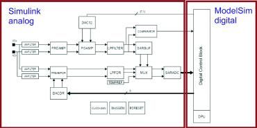 確定磁場之后是傳感器系統仿真。AMR 元件的電阻變化是各向異性磁阻效應的直接結果。這樣,磁場仿真的結果會導致代表信號處理中輸入信號的電阻發生變化。對模擬前端進行建模可采用 Simulink。這種行為模型是概念設計的產物,標志著產品開發的起點。每個 Simulink 塊對應一個模擬信號處理組件,例如放大器或過濾器。但是,尚未考慮模擬組件的控制部分,這由數字系統實現。HDL 設計則仿真通過數字方法實現的功能,而且在完成產品開發之后就會最終成形。因此,整體系統仿真是 Simulink 對模擬組件的行為模型以及 ModelSim 對 HDL 設計的共同仿真(圖8)。可通過仿真從概念階段順利過渡到 HDL 設計及后續階段。在共同仿真中,可用 ModelSim 中部署的 Verilog 代碼逐漸代替 Simulink 參考模型,從而可逐項驗證 HDL 設計。可持續進行此過程,直到在 Verilog 中實現整個數字部件,而模擬系統部件仍保持為 Simulink 模型。此工具組合也已證明對 IC 評估同樣有用。自始至終使用這種工具可以更容易理解 IC 行為,并可創建用來分析和解釋任何錯誤的框架。這些工具的主要好處在于,能夠更快速、更準確地答復客戶的查詢,以及更好地了解與環境條件相關的傳感器功能。
