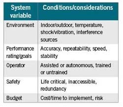 MEMS慣性傳感器可靠度高(汽車行業20年的應用歷史證明了這一點),它在手機和視頻游戲中的成功應用說明它在商業上極具吸引力。然而,不同應用對性能的要求大不相同,適合游戲的器件并不能解決本文所述的高性能導航問題。對于導航,重要的MEMS性能指標是偏置漂移、振動影響、靈敏度和噪聲。精密工業和醫療導航所需的性能水平通常比消費電子設備所用MEMS傳感器的性能水平高出一個數量級。表3列出了有助于傳感器選型的一般系統考慮。