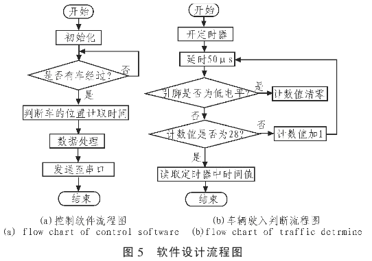 控制軟件需要保證紅外線對射管一對一工作,且對信號采集處理,對采集的信號編寫算法程序,完成對物體是否遮擋紅外線對射管的判定,即分辨紅外線接收管是否被導通。通過單片機內部計數器計取脈沖個數,可以將物體遮擋某個紅外線接收管的時間記錄下來。程序流程如圖5(a)所示,需要不斷判定第一個紅外線接收管的輸出狀態,當確定有物體遮擋時,將開始標志位置為1,單片機開始讀取其他接收管狀態,同時啟動定時器,下一對紅外線對射管的接收管被遮擋停止計時。紅外線發射管按順序依次發射紅外線,處理單元依次讀取紅外線接收管狀態,可以防止鳥或人無意遮擋引起的誤判現象。判斷有物體遮擋的程序思想為判斷1 ms內,是否有物體遮擋,若沒有物體遮擋,紅外線接收管輸出的脈沖波形保持不變;若有物體遮擋,紅外線接收管輸出高電平持續1 ms以上。紅外線接收管輸出狀態是否為高電平,可以判斷是否有物體遮擋。當按順序掃描的前一對紅外線對管被判定遮擋時,開始掃描下一對管子的脈沖個數,同時開啟定時器。延時50 μs,判定接收管接收到的是否為脈沖,判定是否為脈沖則需要判定引腳是否為低電平,如果引腳為低電平,計數值清零。計數值并不是計數器的值,而是計算延時50μs的次數是否達到28。