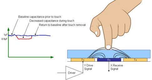 大部分的智慧型手機觸控螢幕都能對手指電容產生反應,觸控螢幕內有許多排列整齊的感測器,會偵測出因手指移動所導致的電容變化。當你的手指觸碰到螢幕時,就會影響這些感測器的自容(Self-capacitance),以及彼此之間的互容(Mutual Capacitance)。大多數智慧型手機都是感測互容而不是自容。由于互容是反映一對感測器之間的互動關系,因此可用來收集有關螢幕上每個位置的資訊(X×Y個感測點);自容則僅能用來偵測每個感測器的反應(X+Y個樣本),而不是每個點。