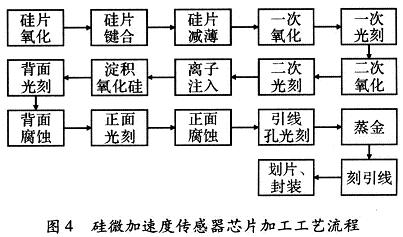 壓阻式傳感器的懸臂梁常采用CVD工藝在硅片上外延生長(zhǎng)一層外延層刻蝕而成,文中試用鍵合工藝制造壓阻式加速度傳感器。采用鍵合工藝優(yōu)點(diǎn)是能得到高質(zhì)量的外延層,且懸臂梁的厚度通過(guò)硅片減薄工藝易于得到保證,精細(xì)的硅片單面研磨,厚度誤差可以控制在0.5 μm以?xún)?nèi);且不需要電化學(xué)自停止腐蝕,依靠EPW腐蝕液對(duì)SiO2的腐蝕速度極慢,使得腐蝕過(guò)程停止在SiO2層上,從而保證了硅片減薄后的厚度即為彈性梁的厚度。制作的傳感器芯片尺寸3 mm×5 mm,封裝在陶瓷管殼中。選n型硅片,晶向(100),直徑為50mm,厚度為300μm,電阻率為5~12 Ω·cm。傳感器芯片加工工藝流程,如圖4所示。