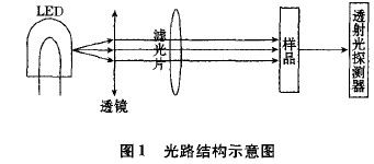 系統要求光電傳感探測部分具有較高的檢測精度和穩定性,且實時性高,即需要對待測海水進行連續不間斷的在線測量,因此采用近紅外LED作為光源。光源發出的近紅外光經過光學鏡組選擇得到對溢油具有特征吸收的分析光,經透射與樣品室的樣品發生相互作用,然后進入光電探測器,將光信號轉換為電信號,從而實現對樣品成分的檢測見圖1所示。