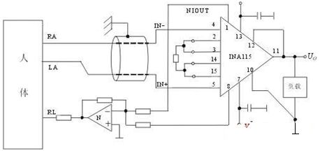 圖1是INA115在心電檢測電路中的實用電路。放大器的正負(fù)輸入通過心電傳感器分別接到人體的左臂(LA)與右臂(RA)上,與運放N和電阻R1~R4組成的驅(qū)動網(wǎng)絡(luò)接到人體的右腿(RL)上,構(gòu)成“浮地”。由于生物信號很弱,加之有極化電位,所以該級的放大倍數(shù)不宜太高,一般取在10~100之間,并且只能作為前置放大用,為了檢測安全,后級一般應(yīng)再采用隔離放大電路進(jìn)行隔離,且該級的電源電壓最好應(yīng)采用隔離電源模塊進(jìn)行提供,以達(dá)到電源及信號的完全隔離。如圖2所示,