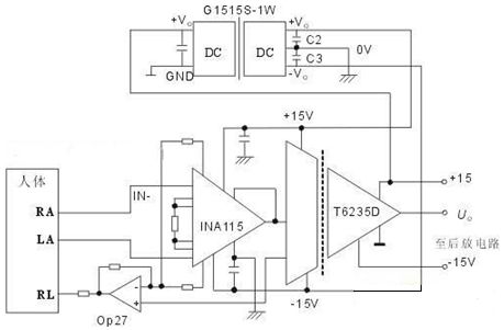 以上電路是由漢為公司的T6235D與INA 115等組成的隔離型心電檢測前置放大電路,該電路由于其具有輸入阻抗高、漏電流小、檢測精度高和滿足人體安全等指標(biāo)完全可以達(dá)到醫(yī)療器械使用的要求標(biāo)準(zhǔn)。該電路一般作為前置放大電路,器件直接與人體接觸,并拾取心電信號后通過INA115進(jìn)行放大,最后由ISO122隔離傳輸?shù)胶笾梅糯箅娐罚瑢崿F(xiàn)人體信號與輸出及電源的隔離放大。