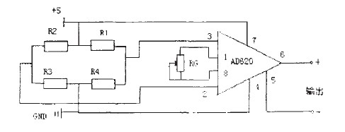 我們選用的高精度低噪聲儀用放大器AD620,可以用在傳感器輸出信號小的放大器中,如光電池傳感器、應變片傳感器以及壓力傳感器等。由于它具有低噪聲、增益精度高、增益溫度系數小和高線性度等優良性能。用于此系統中是非常理想的。AD620是一種只用一個外部電阻就能設置放大倍數為1-1000的儀表放大器,具有良好的直流性能和交流性能,AD620的體積小、功耗低成為應用在壓力傳感器中的重要因素,傳感器信號放大電路如圖5所示。