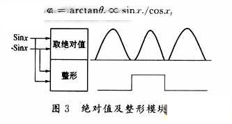 從原理上可以看出,該細分模塊的技術關鍵是比較器整形產生的卦限信號和A/D模塊產生的地址信號必須同步,這是能否正確細分的關鍵。因此,在電路設計過程中,比較器的滯后及其抗干擾能力是必須考慮和解決的問題。在抗干擾方面,采用差分放大,可以有效地抑制共模干擾。考慮其滯后問題,采用整形電路與取絕對值電路分離,可以通過調節各個運放的直流參數,使得卦限信號與絕對值信號能夠近似同步,否則,產生的細分方波將會在過零處變得混亂。如圖3所示,對其中sinx信號取絕對值及整形,這樣一來,既方便了調試,也避免了干擾及比較器的滯后問題。