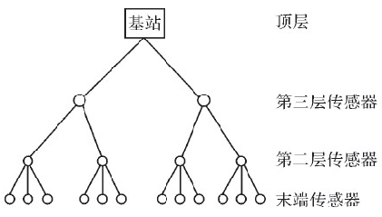 該網絡體系結構有4層。最底層由所有的末端傳感器組成,這些末端傳感器從周圍環境中收集數據。第二層和第三層由監控節點組成,第二層傳感器監控末端傳感器的通信模式;第三層傳感器監控第二層傳感器的行為。第三層傳感器布置時要求:每個第三層傳感器能夠監控2個第二層傳感器間的通信。最后,頂層傳感器就是基站,通常人工操作。