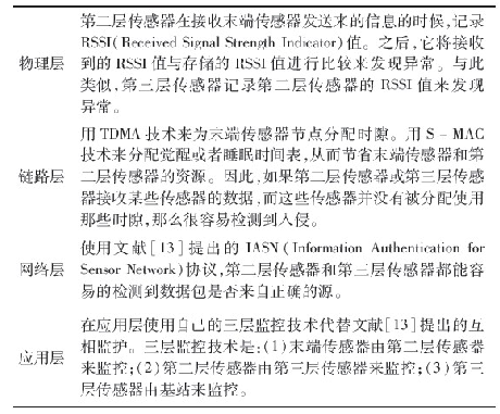 修改了Da Silva等人提出的入侵檢測算法,并將它運用在第二和第三層傳感器上。由于傳感器資源有限,沒有在任何末端傳感器上運用IDS.監控節點的功能被分成三個階段。第一階段:所有的末端傳感器從它們周圍環境收集數據,然后報告給第二層傳感器。第二階段:用基于分層的攻擊檢測方法來檢測文獻提出的攻擊類型。表2描述了攻擊在各層中如何被發現的。這種基于分層的攻擊檢測方法使得系統更完善。第三階段:比較每個上報的結果來定義閾值,以此來決定是否要發出一個報警。第三階段常常可以減少錯報率。閾值可以人工定義或者根據特定的WSN需求來調整。因此,提出的入侵檢測體系結構通過減少錯報能夠檢測到大多數的安全威脅。