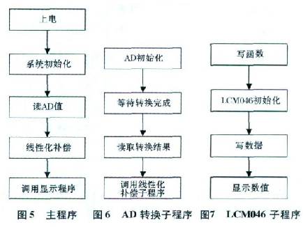 軟件設計主要包括A /D 轉換程序和LCM 046 數據顯示兩部分。另外還有非線性補償部分, 在線性不好的情況下可以采用插值法進行必要的線性補償。軟件流程圖設計如圖5、圖6、圖7所示。