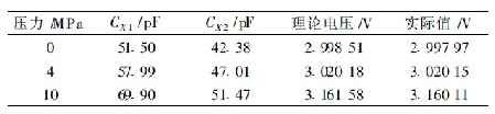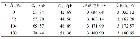試驗中差動式電容傳感器的低壓端連接CAV424的C X2管腳, 高壓端連接C X1管腳。根據差動電容值的變化范圍, Cosc這里取82 pF, 則fOSC = 29. 036 kH z;GLP = 1 +RL1/RL2中的RL 1, RL2分別取300Ω 和100 Ω , 這樣使得CAV424輸出的電壓范圍在25~3 75 V, 在ADC 模擬輸入范圍內。試驗中選取兩種量程的電容傳感器作為實驗的測試對象, 分別是130 Pa 和10M Pa 兩種。