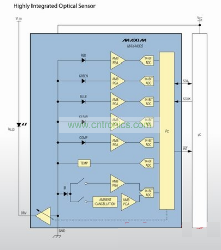 · MAX44006/MAX44008集成RGB傳感器、ALS傳感器、IR傳感器和溫度傳感器。