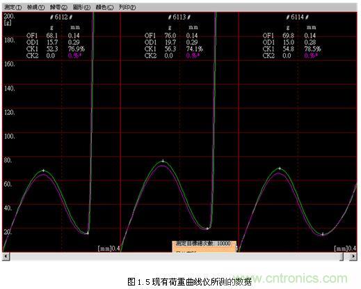 圖1.5所示是現有荷重曲線儀所測的數據,由左至右1底座段差剛好同彈片的BP點,2 底座段差大于彈片的BP點,3底座段差遠大于彈片的BP點,荷重測試機所繪的曲線在OF及OD上都會有+記號。尾段急速上升的直線 若是剛好在+記號上,即為立即導通的曲線BP點是針對彈片本身而定,而OD點是針對成品來討論。