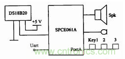 綜上所述,整體硬件電路組成如圖1所示,由SCPE061A單片機實現系統整體控制并實現語音或鍵盤編程與語音播報,系統可通過通用異步串行接口實現聯網功能,在不需要聯網的場合,溫度計也可以單獨使用,實現了系統的可裁剪,DSl8B20用來實現溫度檢測。