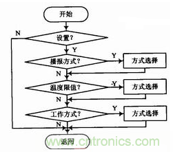 可設置的參數主要有,播報方式:“連續、隔x秒、禁止”;報警溫度值;工作方式等。在需要實時關注溫度值的時候,可以設置為連續播報;溫度變化較慢的時候可以設置為隔x秒方式;夜晚設置報警模式后,可以設置為禁止播報模式。設置報警溫度值后可以,可以處理其他事情,在出現警情時,系統給出報警,提示用戶。選擇工作方式為“聯網工作”后,系統除了現場播報和報警外,還將相應信息通過異步串行口發送到遠端。設置過程全部采用語音菜單方式,可以大幅度較低成本,設置流程圖如圖2所示。