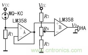 圖l中,R1是傳感器要求的負載電阻,阻值為120 Ω,Vcc為9 V電源電壓;A、B為LM358雙運放,A為跟隨器,起緩沖隔離作用,以便將R1上的電壓VR1基本上全部施加到比較器B的同相輸入端。RW為報警靈敏度調整電位器。穩態時,調整RW使得加到比較器反相輸入端的電壓V-略高于穩態時R1上的電壓VR1這個電壓越高,報警靈敏度就越低。加電并使傳感器達到穩態后,MQ-KC為較穩定的固定阻值,當Vcc不變時,VR1基本為一固定值,保持不變。當有可燃性氣體泄露時,傳感器接觸到可燃氣,使其電導率上升,電阻下降,使VR1上升,當VR1高于V-時,比較器輸出一個大于7 V的電壓,從而使蜂鳴器HA發出滴、滴的報警聲。若用該電壓控制一個繼電器,即可實現控制功能。為了提高抗干擾能力,可分別在R1和B的V-端并聯一只濾波電容。