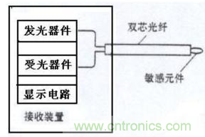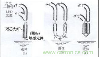 光纖液位傳感器的工作原理如圖3(b)所示。發(fā)光器件射出來的光通過傳輸光纖送到敏感元件,在敏感元件的球面上,有一部分透過,而其余的光被反射回來。當(dāng)敏感元件與液體相接觸時(shí),與空氣接觸相比,球面部的光透射量增大,而反射量減少。因此,由反射光量即可知道敏感元件是否接觸液體。反射光量決定于敏感元件玻璃的折射率和被測(cè)定物質(zhì)的折射率。被測(cè)物質(zhì)的折射率越大,反射光量越小。來自敏感元件的反射光,通過傳輸光纖由受光器件的光電晶體管進(jìn)行光電轉(zhuǎn)換后輸出。敏感元件的反射光量的變化,若以空氣的光量為基準(zhǔn),在水中則為-6-—7dB,在油中為-25—30dB。可對(duì)反射光量差別很大的水和油等進(jìn)行物質(zhì)判別。