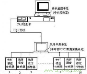 圖5所示可知,監(jiān)測(cè)系統(tǒng)分別由中央控制式的中央監(jiān)控單元和現(xiàn)埸采集單元(或數(shù)據(jù)采集單元)組成。現(xiàn)埸采集單元對(duì)油罐的液位、溫度信號(hào)進(jìn)行數(shù)據(jù)的實(shí)時(shí)采集,同時(shí)完成數(shù)據(jù)統(tǒng)計(jì)、存貯;中央監(jiān)控單元可以定期或不定期地從現(xiàn)埸采集單元獲取數(shù)據(jù)并完成圖像監(jiān)測(cè)、數(shù)據(jù)統(tǒng)計(jì)、報(bào)表、打印及數(shù)據(jù)庫(kù)管理。而中央監(jiān)控單元和現(xiàn)埸采集單元之間通過CAN總線連接在一起,在這個(gè)網(wǎng)絡(luò)中,中央監(jiān)控單元處于主控位置,而現(xiàn)埸采集單元可以隨時(shí)響應(yīng)中央監(jiān)控單元的命令。其現(xiàn)埸采集單元由單片機(jī)8C552及采集、存儲(chǔ)、顯示、遙控和通信模塊組成,每個(gè)現(xiàn)埸采集單元可與光纖液位傳感器、光纖溫度傳感器及光纖液位報(bào)警器等16個(gè)設(shè)備相接。之所以應(yīng)用CAN總線網(wǎng)絡(luò)結(jié)構(gòu)是內(nèi)由于CAN網(wǎng)絡(luò)具有的方便靈活、突出特性,抗干擾性、可靠性、實(shí)時(shí)性等特點(diǎn)。所有的光纖液位傳感器、光纖溫度傳感器及光纖液位報(bào)警器都可以通過一對(duì)雙絞線串接在一起,節(jié)省了空間、簡(jiǎn)化了布線。