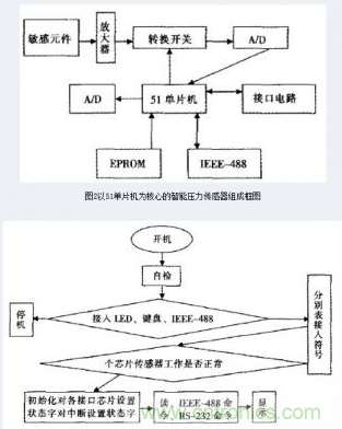 總體結構設計。半導體敏元件、放大器、轉換開關、雙積分A/D轉換器、單片機、接口電路、IEEE~488標準接口、存儲器以及部分外圍電路組合在一起形成了智能壓力傳感器。