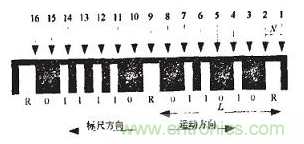 可知,要識別一個完粘的碼區必須設置9個霍爾元件,但為了能隨時識別出一個完整碼區,必須設置16個霍爾元件。以圖2所示時刻位置來說明其丁作過程,其中箭頭表示霍爾元件,數字為其編號。