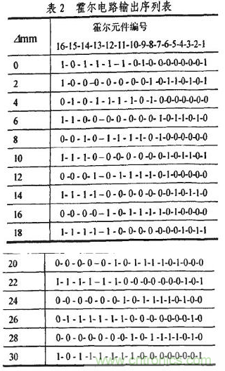 霍爾電路的工作原理是,在外磁場的作用下,當磁感應強度B超過導通工作點時,霍爾電路輸出管導通,輸出低電-半:若曰值低于釋放點時,輸出管截止,輸出高電半。因此在“凸槽”時鋼質活塞桿被磁化,磁感應強度曰增加,霍爾電路導通,輸出低電平,用“1”表示;在“凹槽”時輸出高電平,用“0”表示。以第1個霍爾元件為測量基準,從圖2所示時刻起,位移暈旃次變化b=2mm時,一個碼區行程內霍爾電路輸出的二進制序列如表2所示。分析可知,序列的標識碼為l 0000000 1,其前面或后面6位序列數分別為相鄰的兩個數值碼,這使它具有很強的容錯能力。標識碼每隔一個霍爾元件間距N在低位部分右移一位。值得注意的是,標識碼前面的數值碼代表磁性標尺當前檢測位置下一個碼區的值。