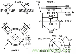 圖2:熱釋電紅外傳感器結(jié)構(gòu)及內(nèi)部電路