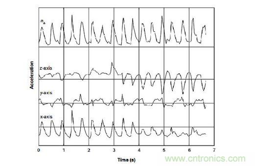 反映到圖表中,可以看到,在步行運動中,垂直和前進產生的加速度與時間大致為一個正弦曲線,而且在某點有一個峰值。其中,垂直方向的加速度變化最大,通過對軌跡的峰值進行檢測計算和加速度閥值決策,即可實時計算用戶運動的步數,還可依此進一步估算用戶步行距離。