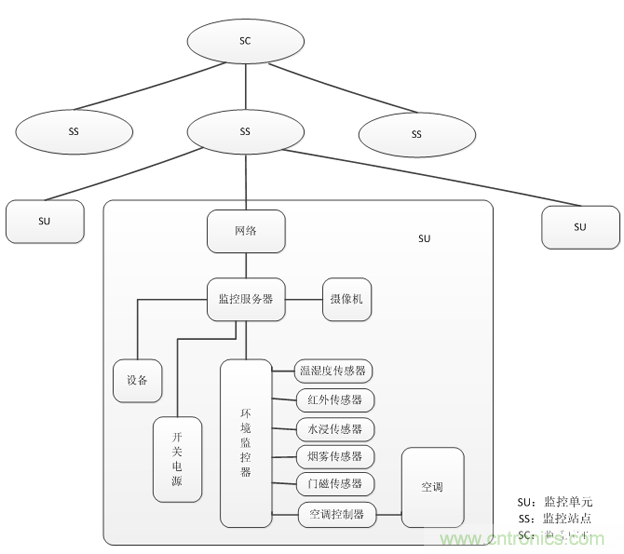 動力環(huán)節(jié)監(jiān)測系統(tǒng)應用在機房、基部站等無人值守的環(huán)境中,對局站內(nèi)的通訊電源、蓄電池組、UPS、發(fā)電機、空調(diào)等智能、非智能設備以及溫濕度、煙霧、地水、門禁等環(huán)境量實現(xiàn)“遙測、遙信、遙控、遙調(diào)”等功能。為了實現(xiàn)對多個量的監(jiān)測,動環(huán)系統(tǒng)集成了各種類的傳感器,是多傳感器集成系統(tǒng)傳感器“多類型”的一個經(jīng)典案例。同時,此監(jiān)控系統(tǒng)充分利用了通訊傳輸設備所能提供的各種傳輸信道資源,可以實現(xiàn)多級網(wǎng)管,能夠?qū)λ芯终镜娜珔?shù)、全方位的監(jiān)控,這又很好體現(xiàn)了多傳感器集成系統(tǒng)傳感器“多數(shù)量”的一面。動環(huán)監(jiān)測系統(tǒng)的組成如下: