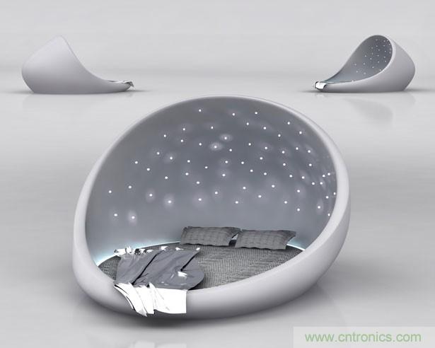 The Cosmos Bed由白色玻璃纖維制成,形狀酷似雞蛋和太空艙,內(nèi)置床墊可根據(jù)需要調(diào)節(jié)傾斜度。其特別之處在于,采用了柔和的LED照明系統(tǒng)模擬星光效果,配合寧?kù)o的音樂(lè)及戶(hù)外特有的氣味,讓你在舒適放松的感覺(jué)下進(jìn)入甜美夢(mèng)鄉(xiāng)。The Cosmos Bed還自帶鬧鈴設(shè)備,就算到了該起床的時(shí)間,也不用擔(dān)心睡過(guò)頭。