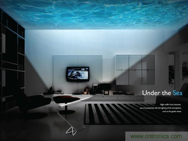 Under The Sea的設(shè)計(jì)理念,正式希望通過(guò)燈光營(yíng)造一種奇妙的氛圍,幫助你快速進(jìn)入睡眠。當(dāng)Under The Sea燈頭朝向天花板時(shí),它可投射出蔚藍(lán)平靜的海面,讓我們仿佛置身于海中。而當(dāng)Under The Sea燈頭朝下時(shí),它又重新回歸正常工作狀態(tài),正常的柔和燈光讓你學(xué)習(xí)、工作、閱讀都進(jìn)行的輕松愜意。