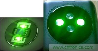 這種方案是追蹤可見光(綠光)在人體組織中的反射。通常是有兩個綠色LED向手腕發出可見光,然后中間有個光電傳感器感應反射光。如下: