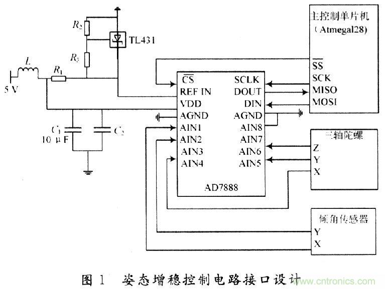 無人機內回路控制作為外回路控制的基礎,對其能否穩定飛行起著至關重要的作用。該系統中,內回路是由三軸陀螺和傾角傳感器構成的姿態增穩控制回路。主要由主控制單片機、A/D采樣芯片、三軸陀螺儀和傾角傳感器組成。主控制單片機通過SPI串行總線與A/D采樣芯片相連,通過A/D采樣芯片獲得三軸陀螺儀的角速率與傾角傳感器的橫滾角和俯仰角,然后進行姿態信息融合,得到無人機俯仰和橫滾的姿態信息。主要接口連接情況如圖1所示。