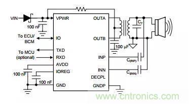 傳感器驅動器的方法和設計將顯著影響超聲波衰減周期和曲線。在需要近場性能的踢腳開啟后備箱應用中,TI建議使用變壓器驅動拓撲結構。圖4是使用PGA460-Q1的變壓器驅動原理圖示例。