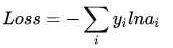 然而實際上x對應的概率其實是第一類,比如[1,0,0],現在拿到的概率(或者可稱為似然)是[0.88、0.12、0]。那么它們之間究竟有多大的差距呢?這個差距就是損失值loss。如何獲取到損失值呢?在softmax里我們用互熵損失函數計算量最小(方便求導),如下所示: