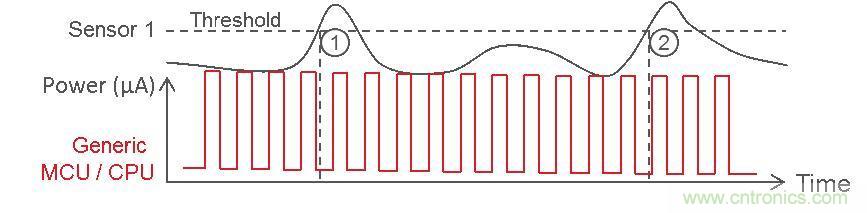 當外部事件超過傳感器閾值時才喚醒 CPU 并不是一個革命性的概念。本質上,它會將恒定的 MCU 工作周期從圖 1 中移至單個事件;當模擬事件超過給定閾值時,MCU 蘇醒并執行各種行動。
