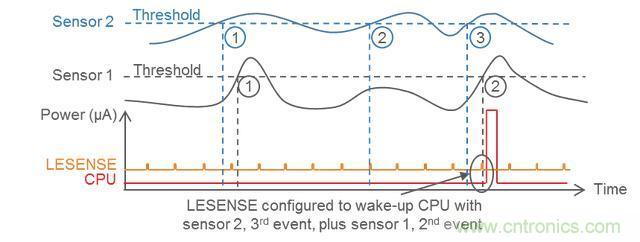在以下概念圖中,LESENSE 被配置為允許傳感器 1 超過其可配置閾值兩次之后才喚醒 CPU。