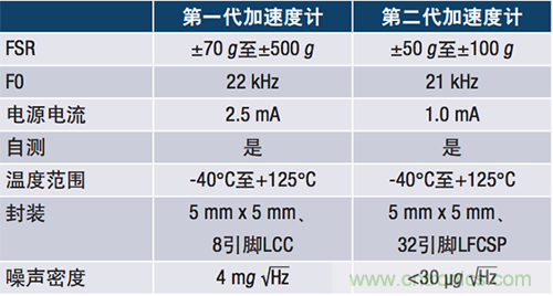 表2. 第一代和第二代MEMS加速度計(jì)針對(duì)狀態(tài)監(jiān)控的關(guān)鍵規(guī)格比較