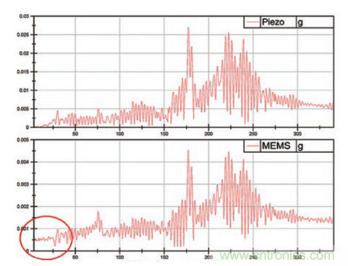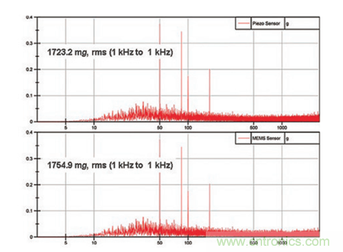 圖2顯示了21 kHz諧振頻率的MEMS加速度計(jì)和25 kHz諧振頻率的PZT傳感器的頻譜測(cè)量結(jié)果。MEMS加速度計(jì)在1 Hz至1 kHz頻段中的均方根(rms)輸出要比PZT加速度計(jì)高出大約30 mg或1.7%。