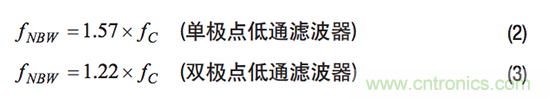 當RND的頻率響應遵循單極點或雙極點低通濾波器曲線時,噪聲帶寬(fNBW)和濾波器截止頻率(fC)將有公式2和公式3的關系。