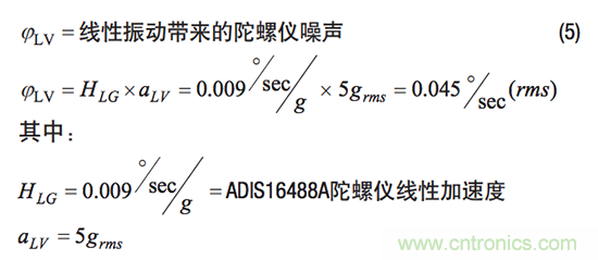 當振動幅度以加速度(grms)表示時,與線性加速度參數(shù)相乘可估算陀螺儀測量中產(chǎn)生的噪聲。例如,當ADIS16488A承受5 g (rms)的振動時,由于線性加速度等于0.009°/s/g,因此其陀螺儀中的噪聲估算值將為0.045°/s (rms)。